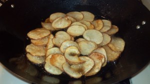 Slice potatoes very thin with skin on. Soak potatoes for a bit before frying and then pat them dry. This helps to remove some of the starch that makes them soggy. Heat oil in a heavy bottom skillet to 375 degrees. Drop potato slices in oil, do not over crowd (fry in batches) using a pair of tongs separate chips and make sure they do not stick together. Fry until golden brown and transfer to paper towels to dry. Sprinkle immediately with salt and Cajun seasoning.