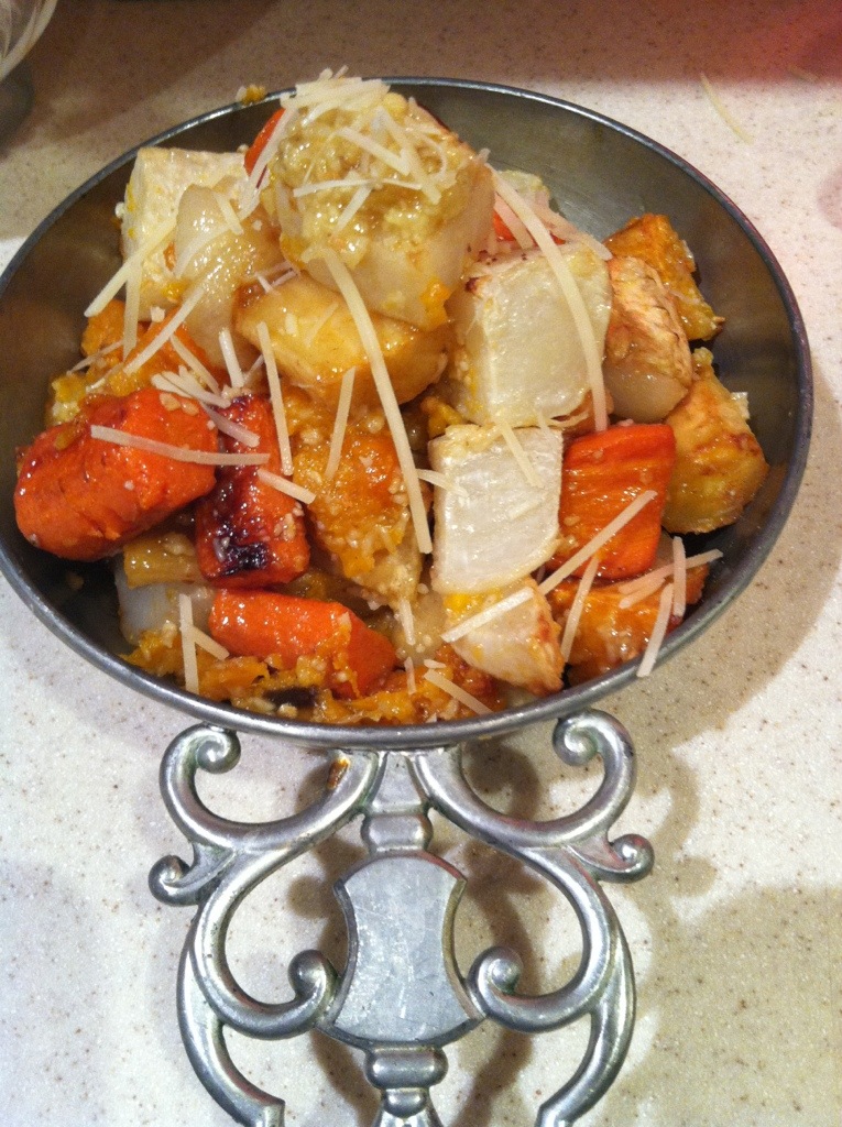 Turn your oven to 475 degrees and let it preheat. Get you a large bowl and toss vegetables, shallots, thyme and ¼ cup of olive oil. Season it up good with plenty of salt and pepper. Roast in the oven for about 35 – 40 minutes, or until vegetables are fork tender. While the veggies are roasting lets make the pesto. Get you a small skillet and heat 1 tablespoon of the olive oil. Add the pine nuts and cook over low heat. Don’t burn them, you must stir constantly for about 2 – 3 minutes. Add you some butter and garlic and cook, stirring, until the pine nuts are browned and the garlic is golden, about 2 minutes. The smell will be unbelievably good. You need to let the pine nuts cool, then transfer to a small processor. Add the parmesan cheese and the remaining 3 tablespoons of olive oil and pulse. Taste and season the pine nut pesto, with salt and pepper, to your likings. Toss the roasted vegetables with the pesto and serve on a large platter. Garnish with Parmesan slivers.