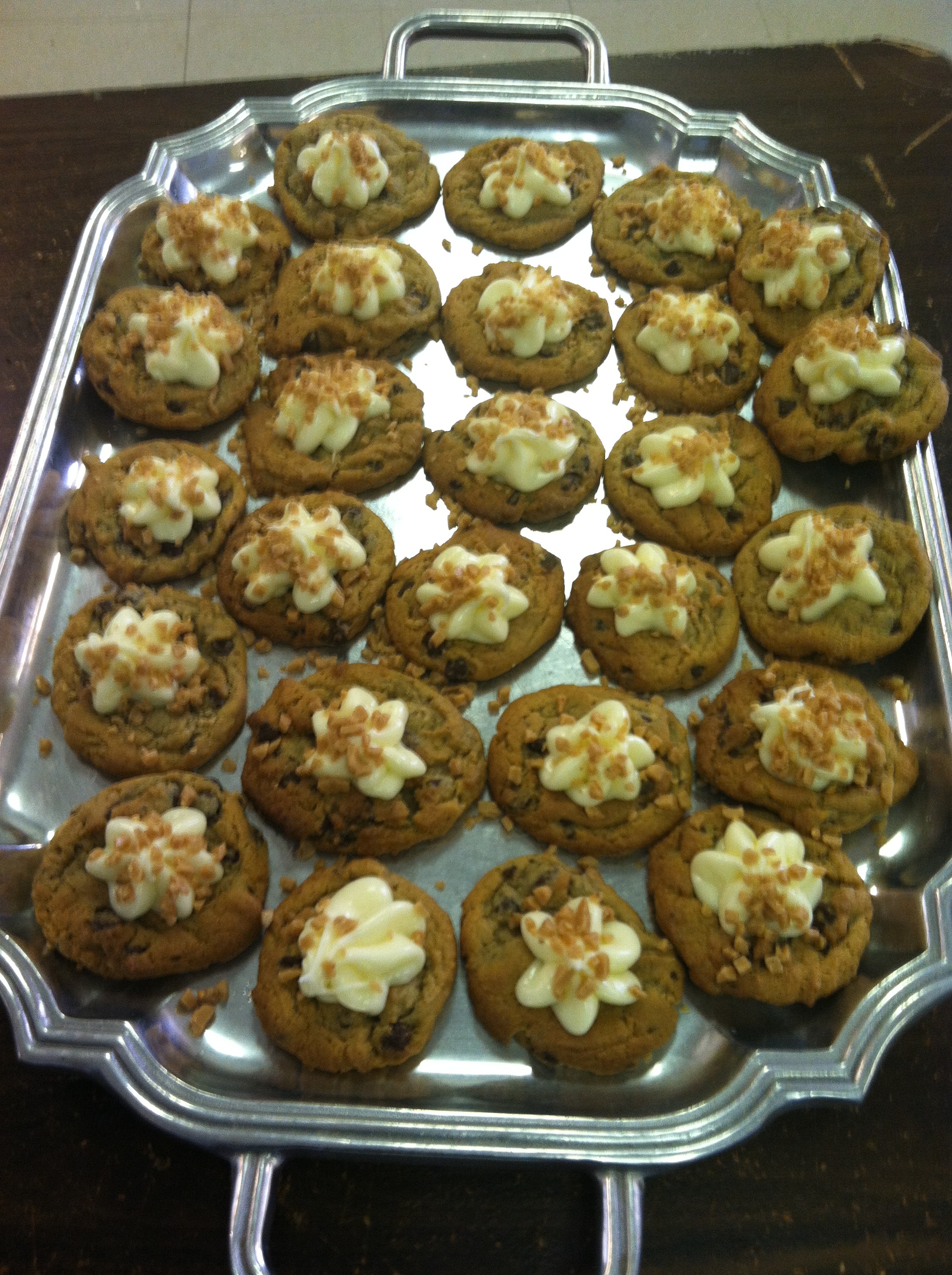 Combine cream cheese, butter, powdered sugar and vanilla in a medium bowl until creamy. Place icing in a piping bag. Once cookies have cooled completly, pipe icing on each cookie and sprinkle with Heath bar bits.