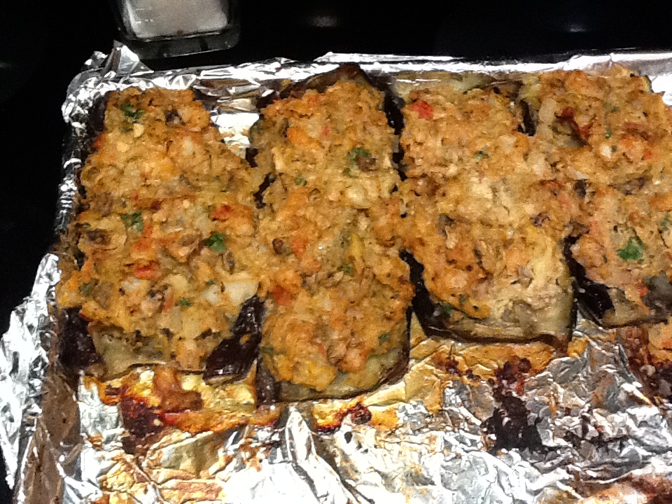 Every spring and summer we visit this great restaurant in Grayton Beach.  They have a wonderful stuffed eggplant.  We order it every time we visit. We decided to make one of our own and it is fabulous.  This recipe is so versatile. I chose shrimp but you could use any seafood, combination of seafood, you can leave the seafood out and add beef or chicken or omit all of the meat. This can be used for a side dish or a main course.