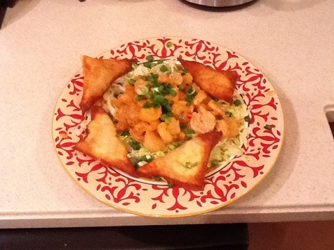 In a large frying pan heat oil to medium high heat. Dredge shrimp in corn starch and fry shrimp until lightly brown. Mix remaining ingredients and toss shrimp in mayonnaise mixture. Serve on a bed of lettuce and top with spring onions.