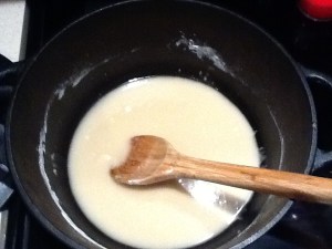 Cook the mixture over medium heat.  Stir roux constantly with a wooden spoon for about 25 minutes. The roux needs to resemble the color of chocolate.
